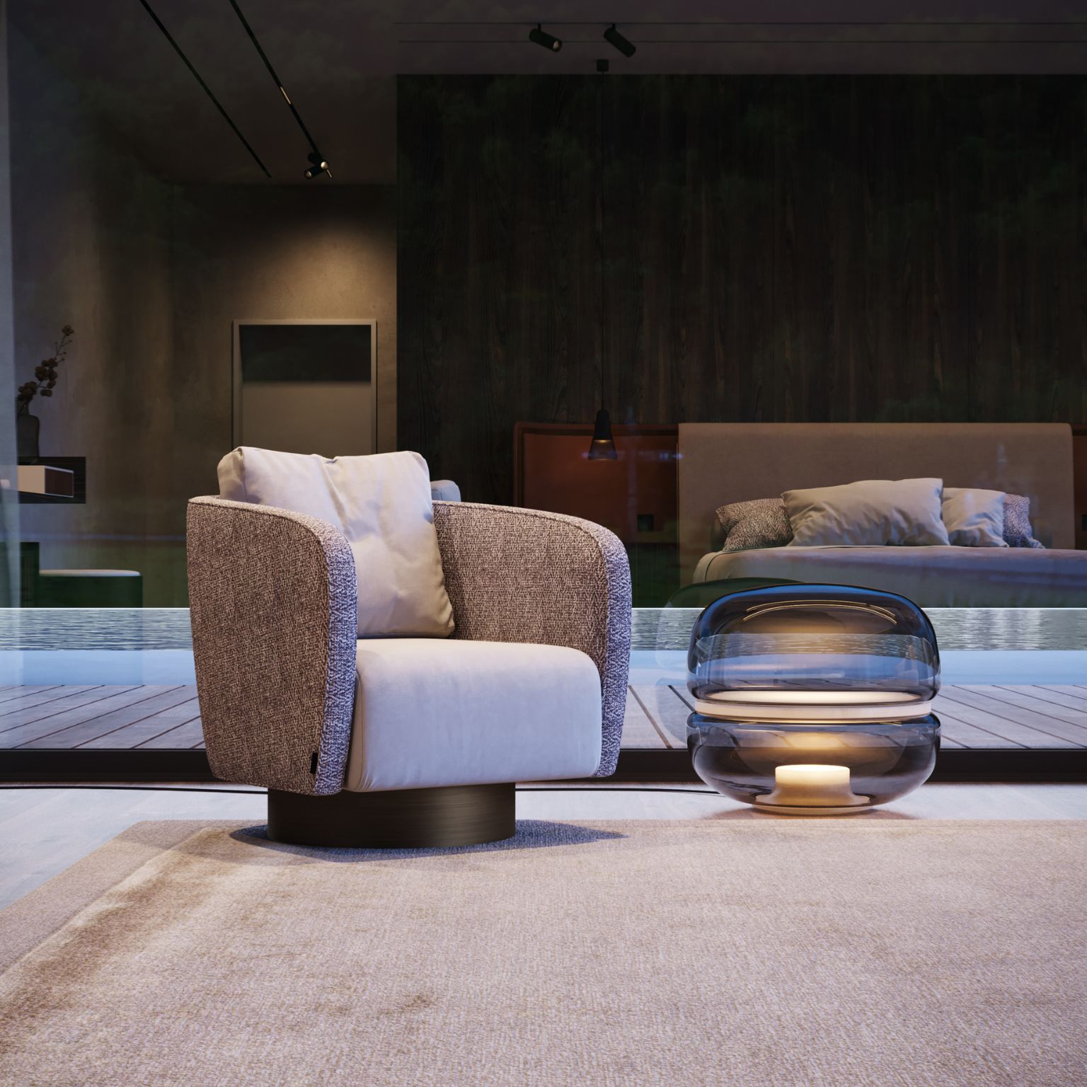 Her armchair upholstered in Paris Cream and with Paris Ebony fabric seat, structure and backrest pillow. Swivel base padded with metal (optional).