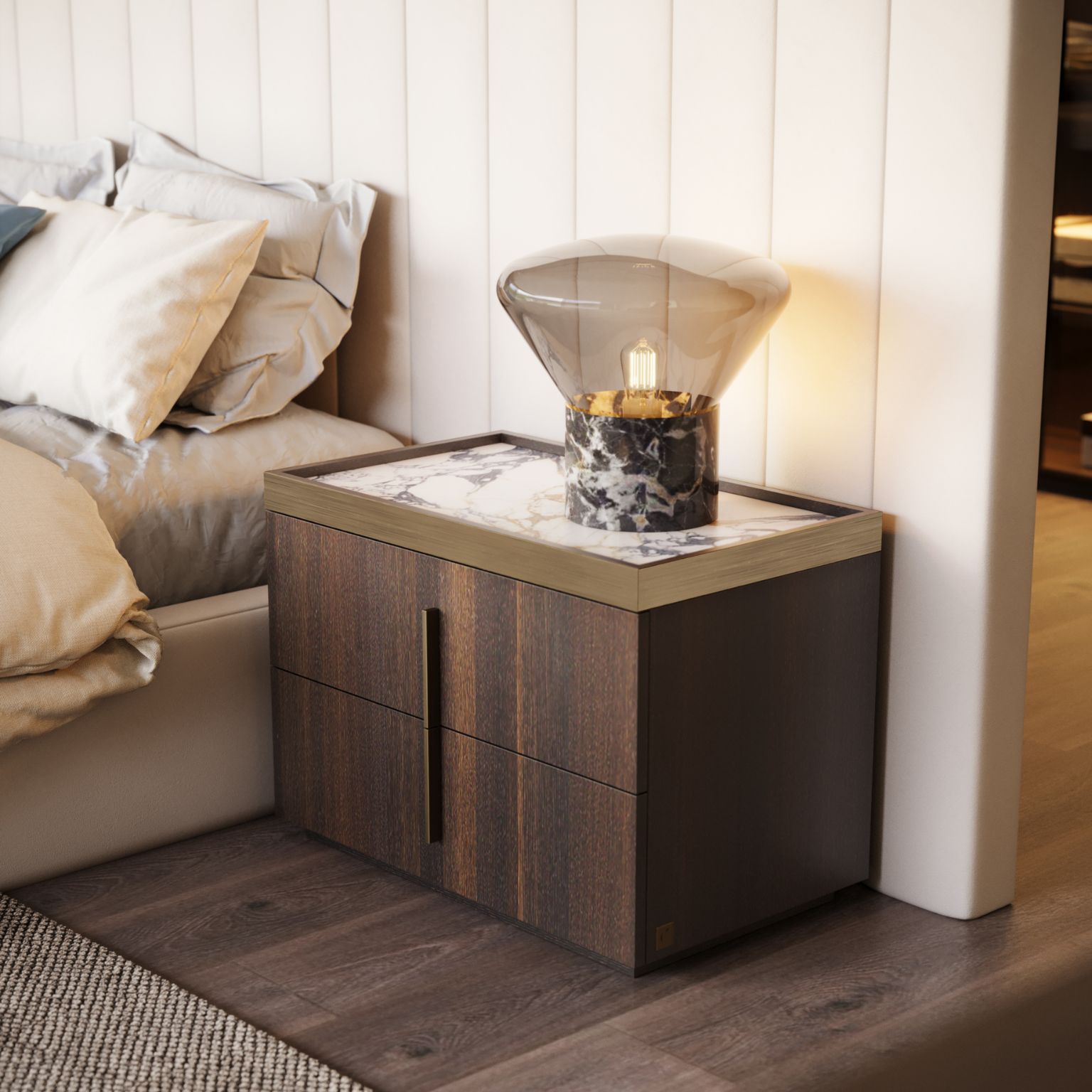 With its robust structure in delicate wood, the Kensington bedside table stands out in its details. The combination of materials highlights the sober and modern design. The ideal piece for a bedroom full of luxury, modern and very sophisticated.