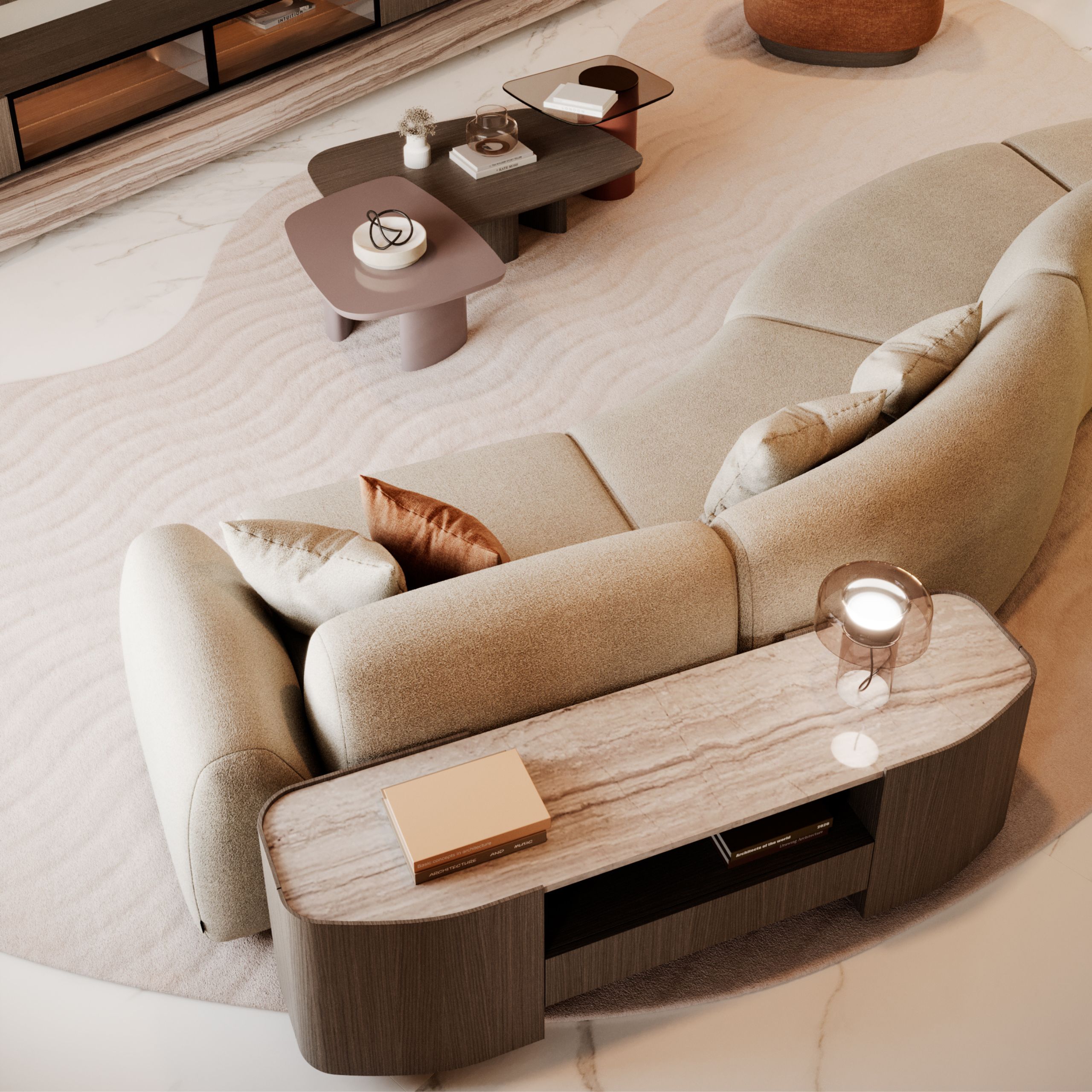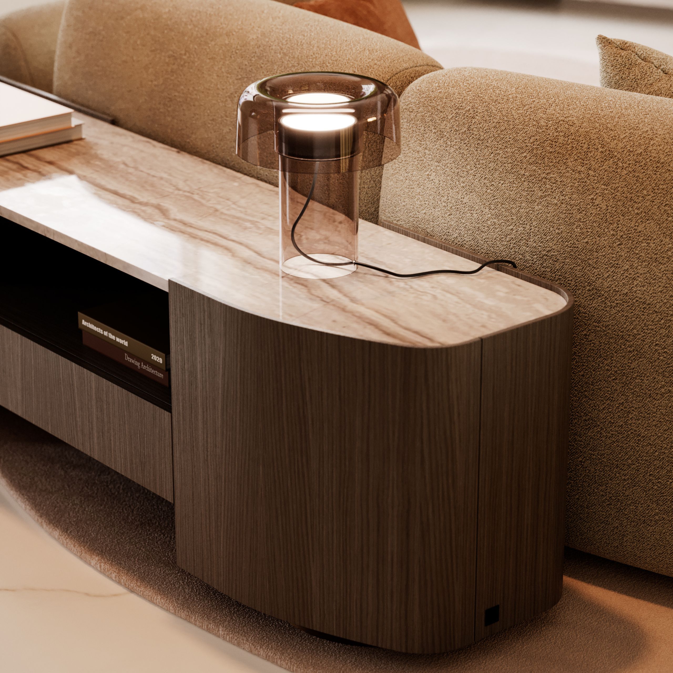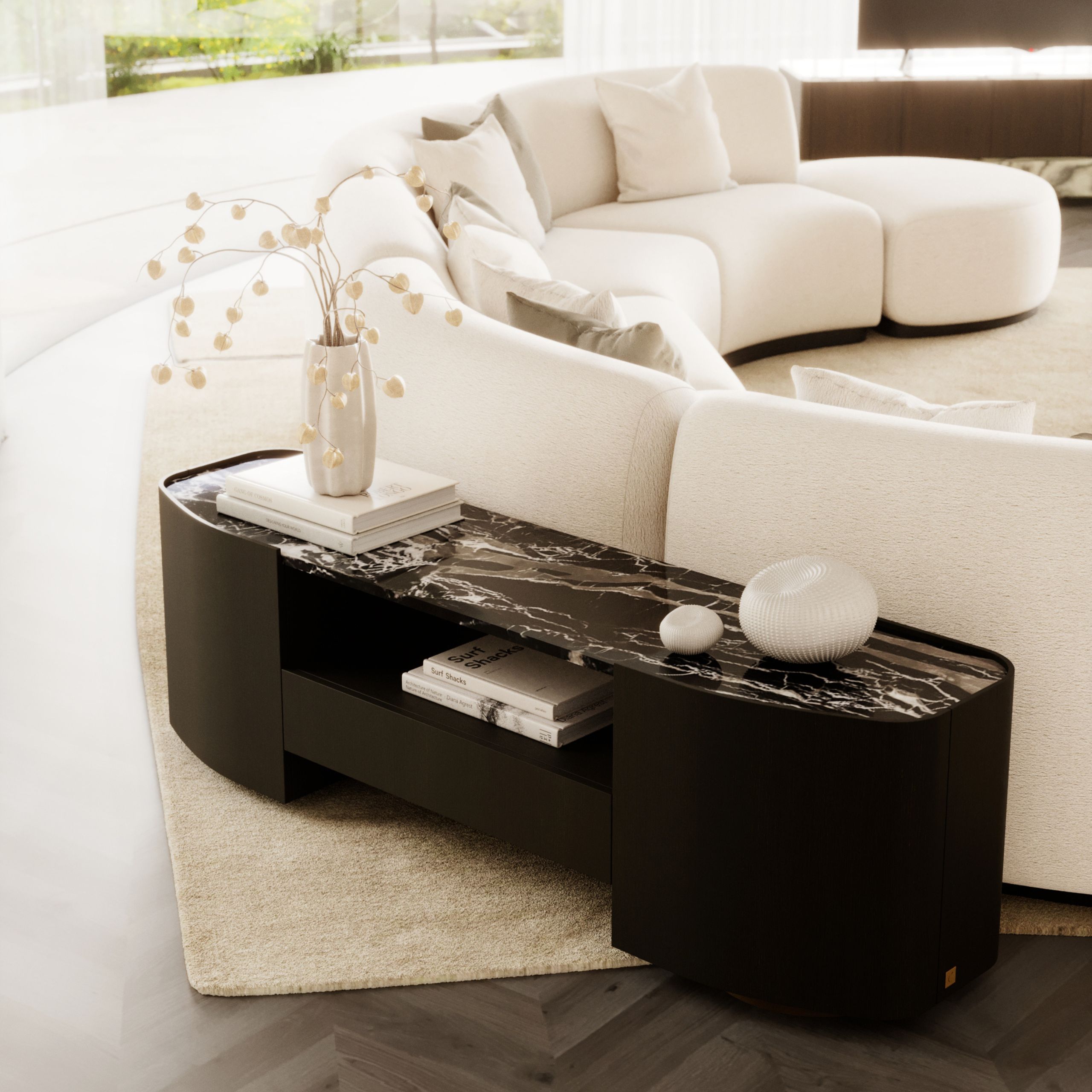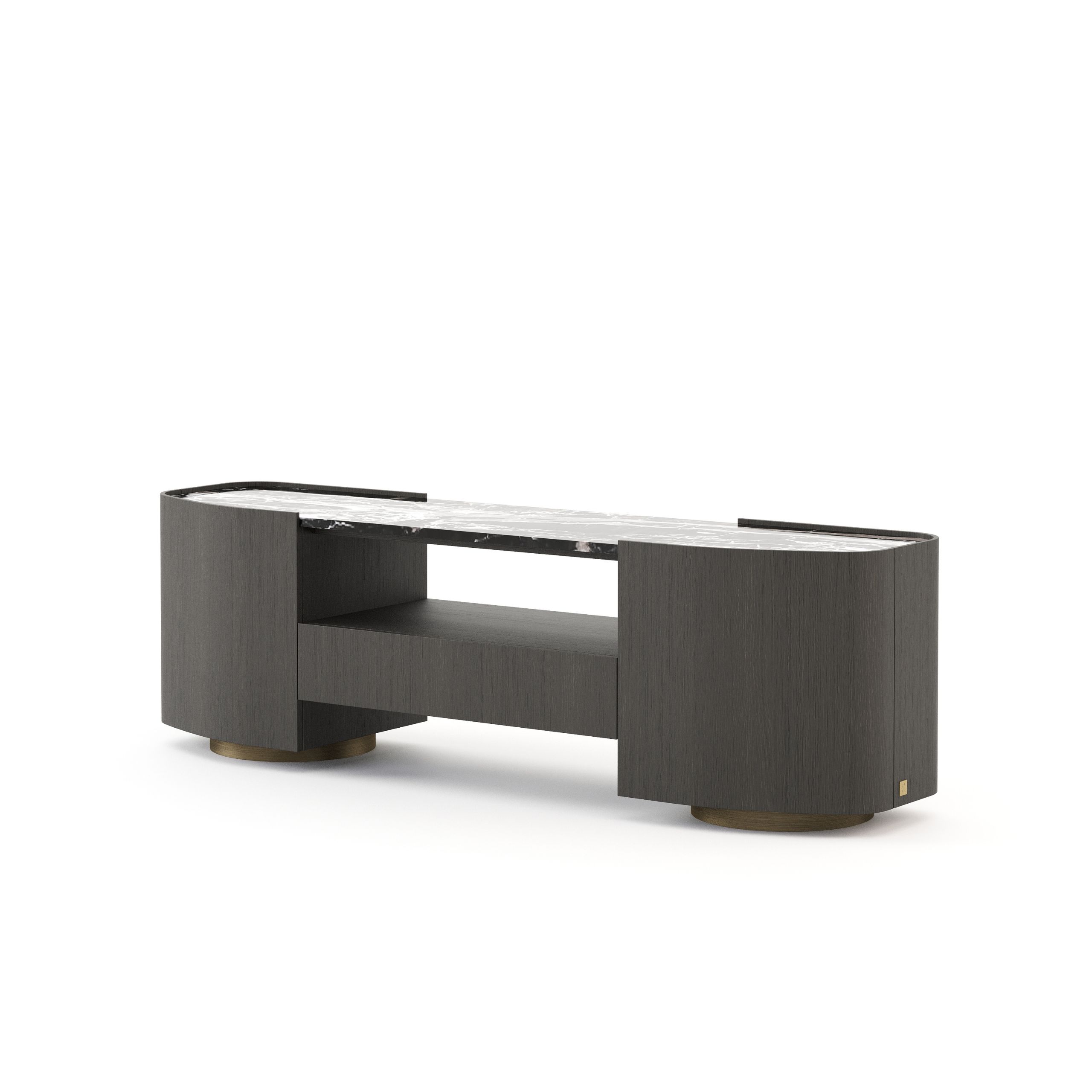 The Stone Low Console takes form from the quiet dialogue between time and nature, where solid shapes are softened by patience and gentle movement. Its grounded presence evokes stones resting along a river’s edge, carrying a sense of calm within the space. The console portrays a connection to the earth, where material and form exist in harmony.