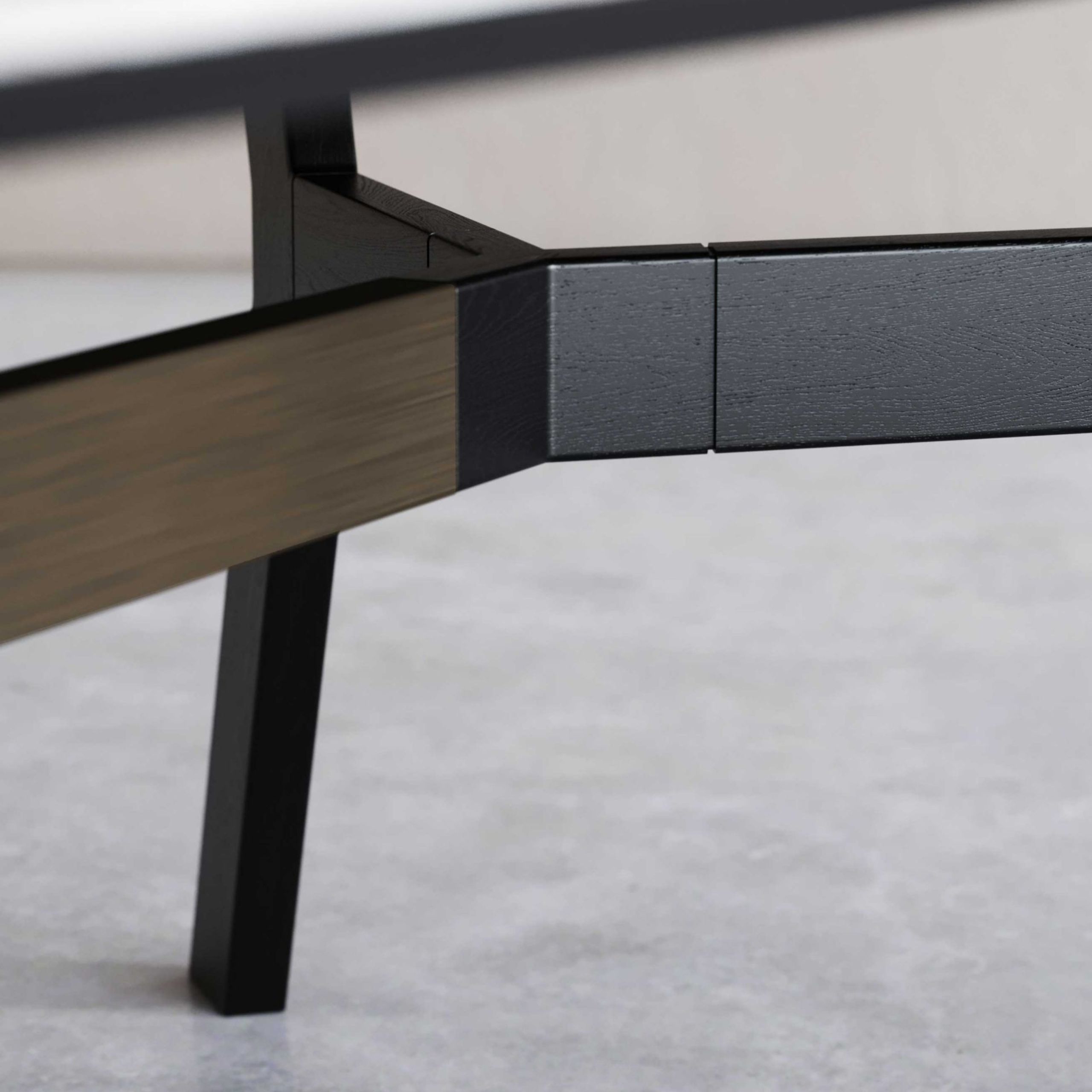 Toro dining table rectangular top in a black oak solid wood structure, antique brushed bronze metal crosspiece and black oak wood veneer top.
