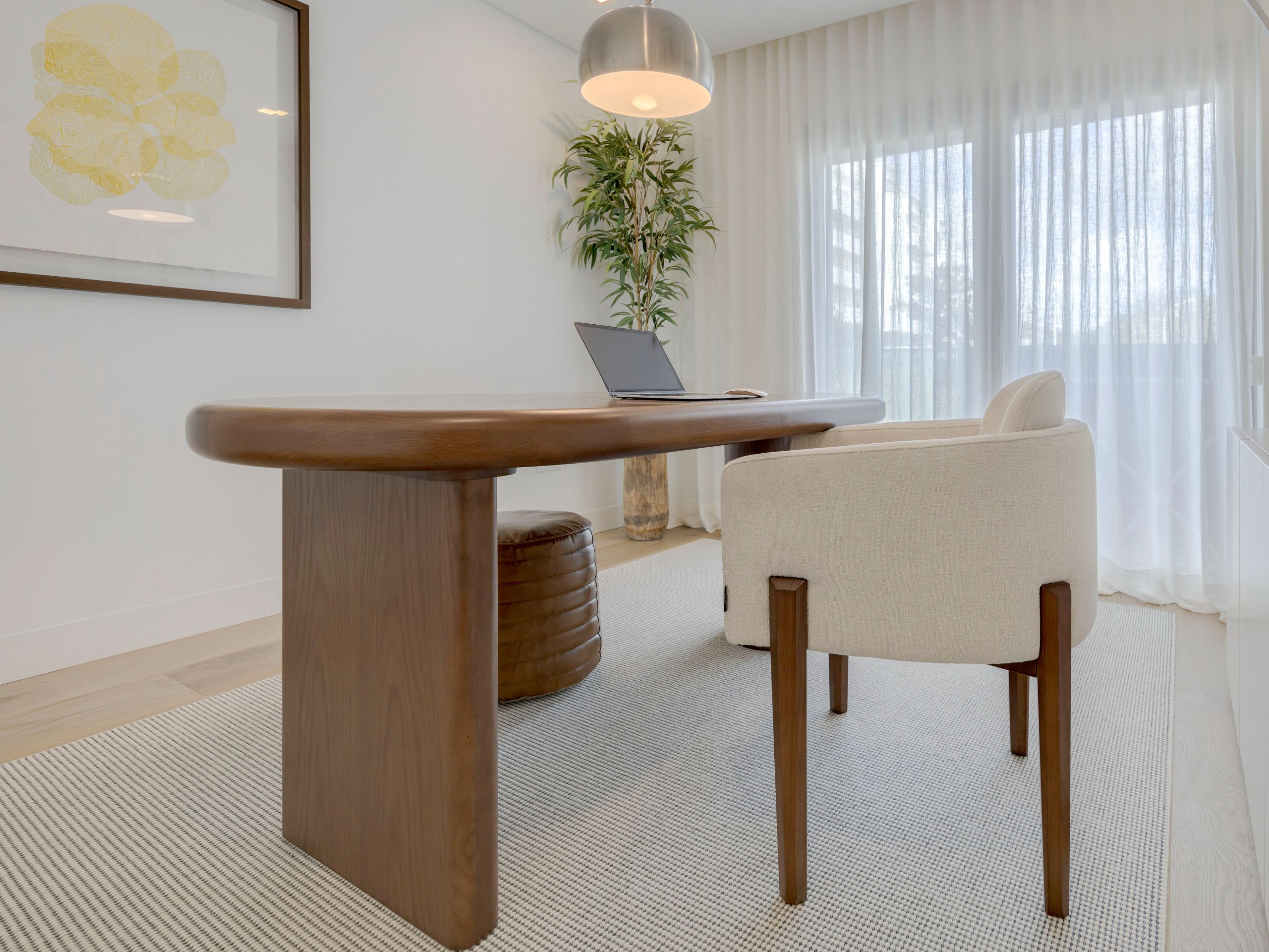 Designed for both productivity and inspiration, the office reflects the evolving dynamics of contemporary living. At its centre, a bespoke version of the Natur Dining Table brings a new perspective to the workspace, combining artisanal character with practical purpose. Paired with the His II chair, which offers ergonomic comfort and an elegant silhouette, the setting becomes inviting and well-suited for focus and creativity.
