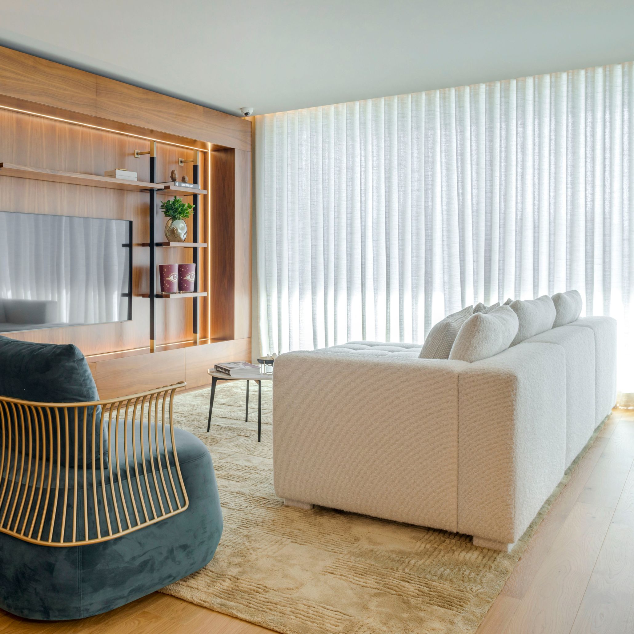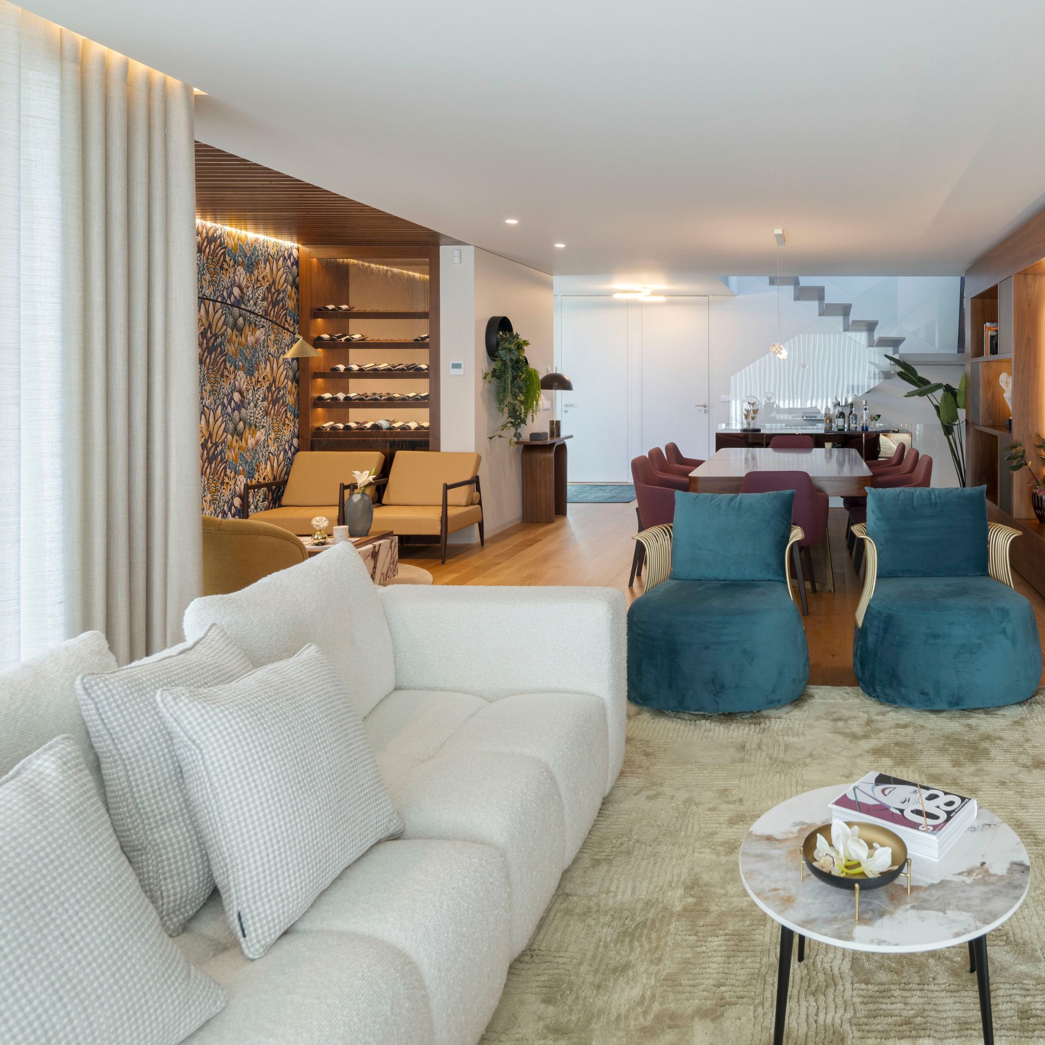 Surrounded by two walls with panoramic windows that illuminate the space, this space has been shaped by the definition of comfort. Its light and inviting energy was crafted through an elegant palette of white and light wood, accented with touches of blue, where the Antónia Sofa takes center stage, enhancing the room with its refined silhouette and inviting softness.
