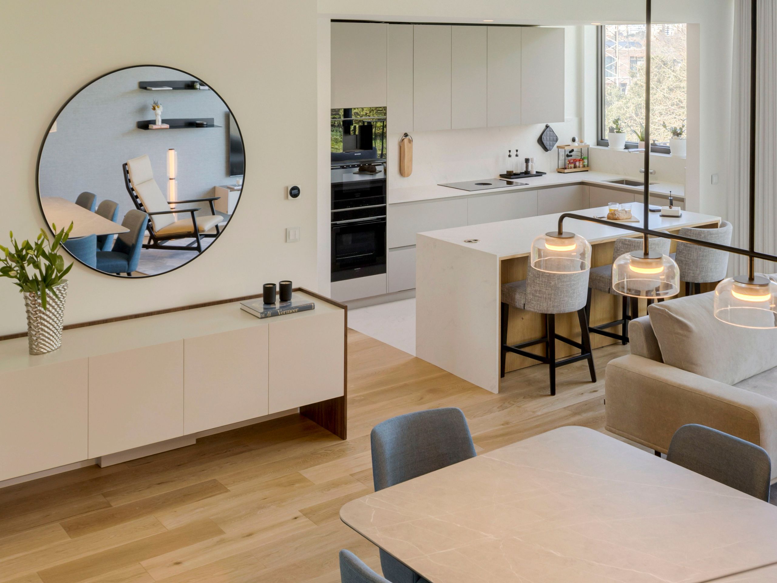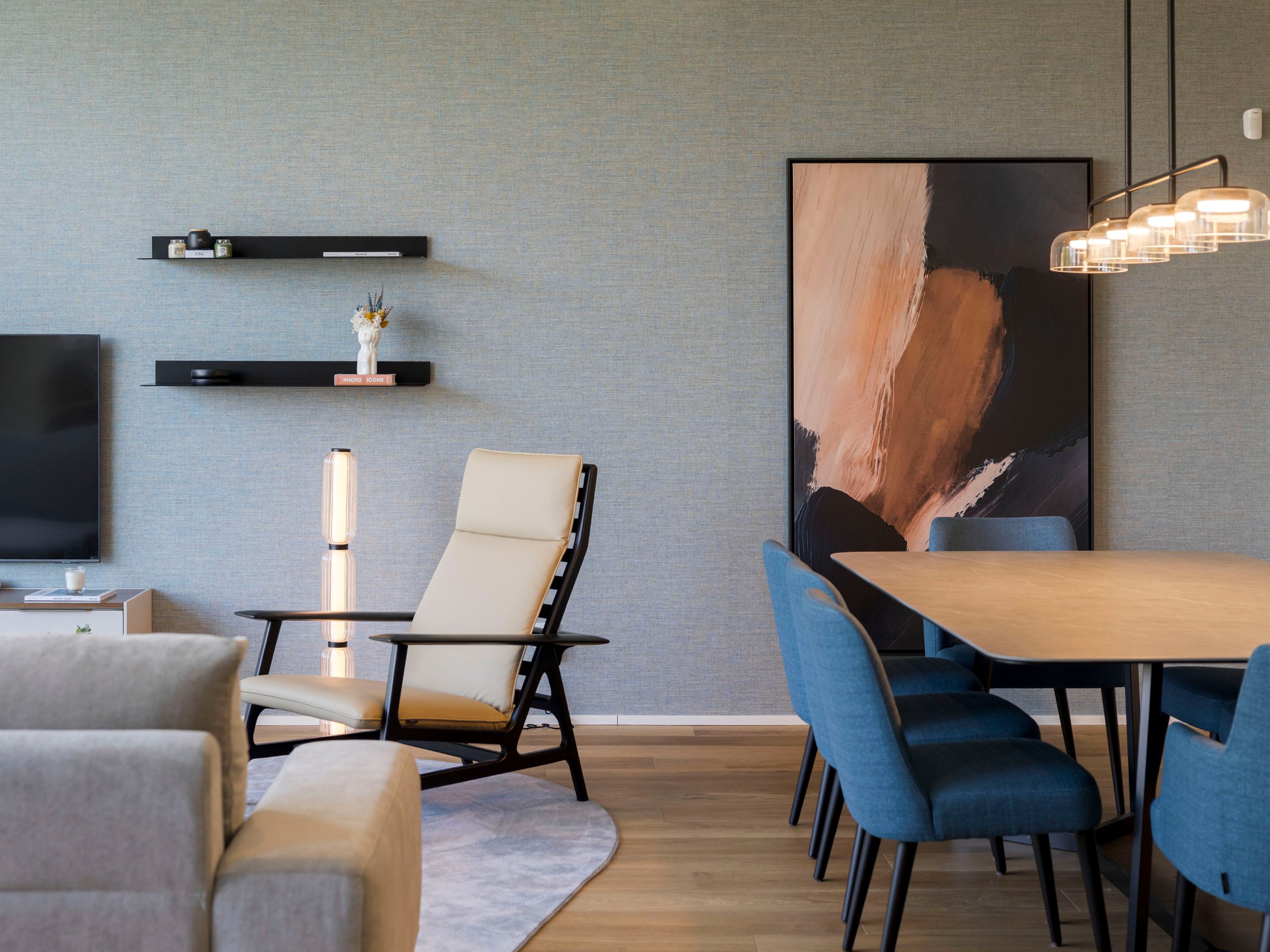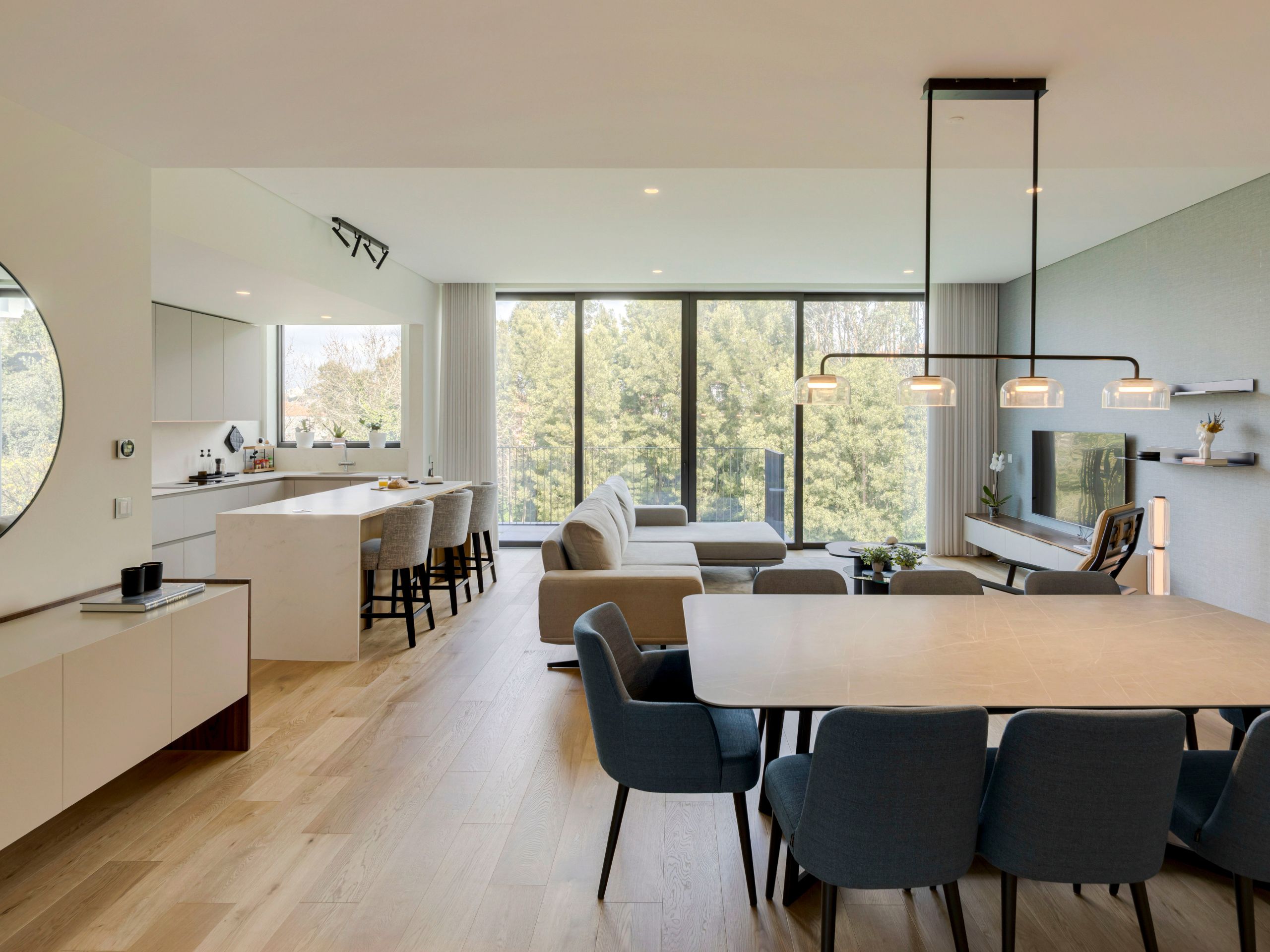 The social area reveals itself as a fluid open-plan layout, where living room design, dining, and kitchen spaces connect perfectly, encouraging moments of connection and sharing. This continuity reinforces a sense of modern comfort, supported by a cohesive palette of wood texture, soft neutrals, and refined finishes.