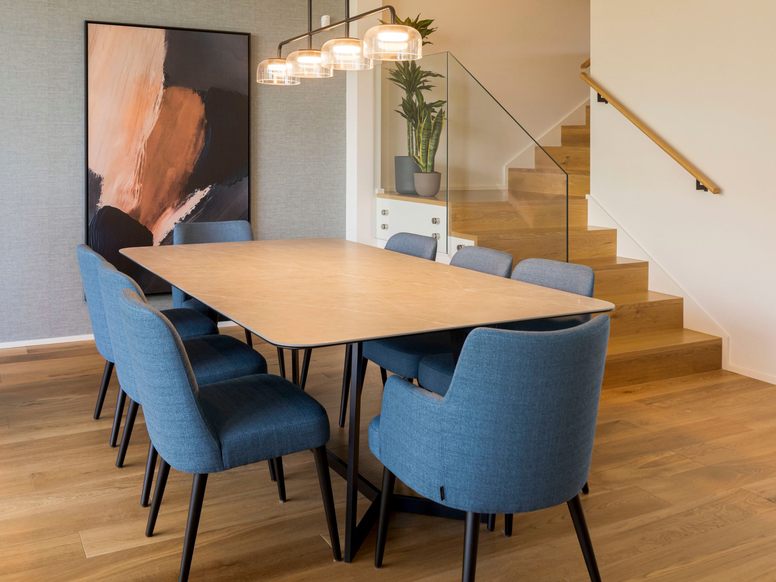 The dining area embraces a more expressive character, centered around the Sky Dining Table, a refined modern dining table crafted in solid wood. Its natural presence establishes a warm foundation for gatherings, combining elegantly into the overall composition of dining room furniture.