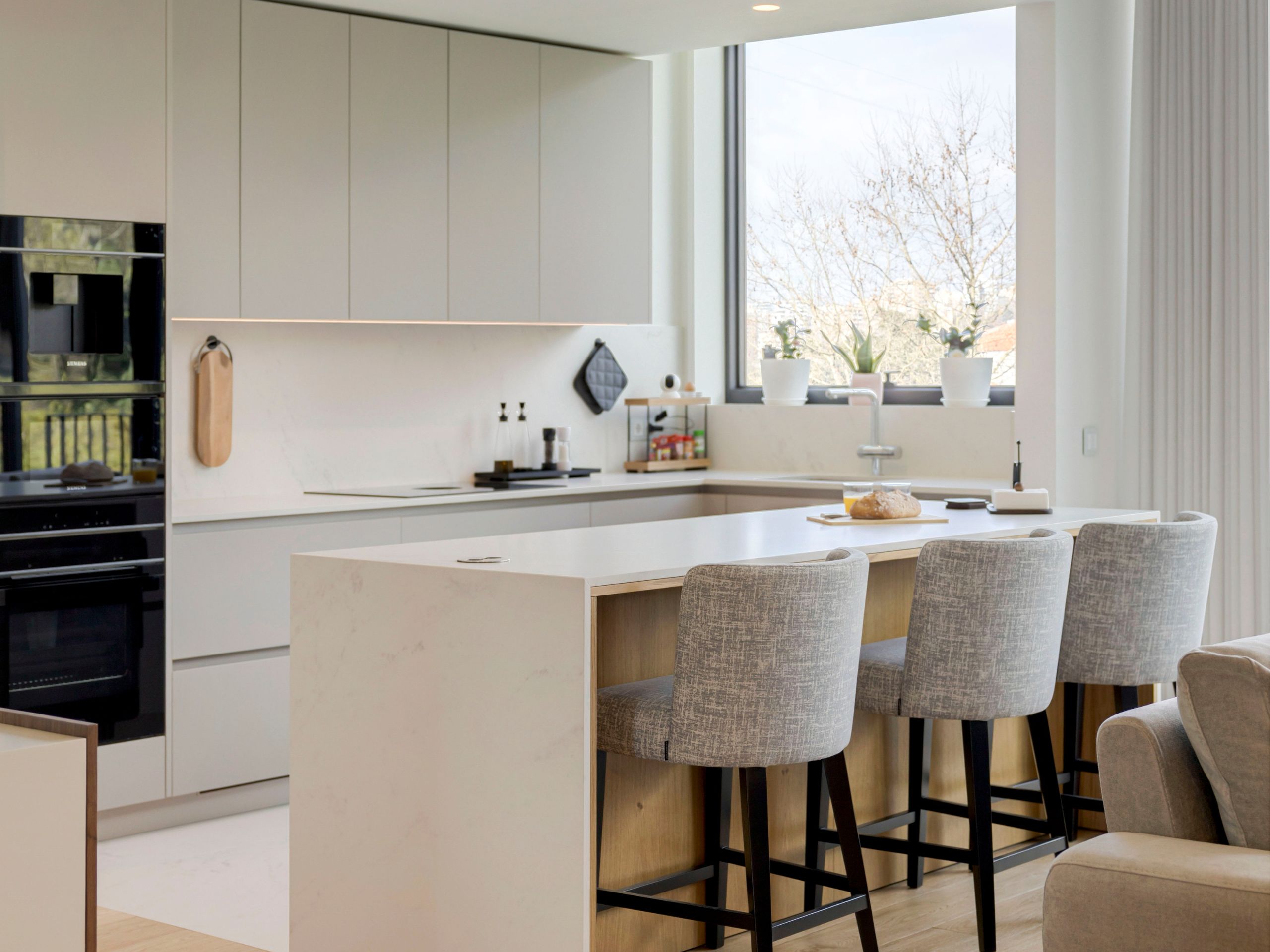In the adjoining kitchen, clean lines and intuitive functionality define the space. The island becomes a natural meeting point, complemented by the Milos Bar Stool, whose design brings comfort and practicality to this modern kitchen furniture setting. These modern bar chairs complete the space with ease, reinforcing the balance between utility and style.