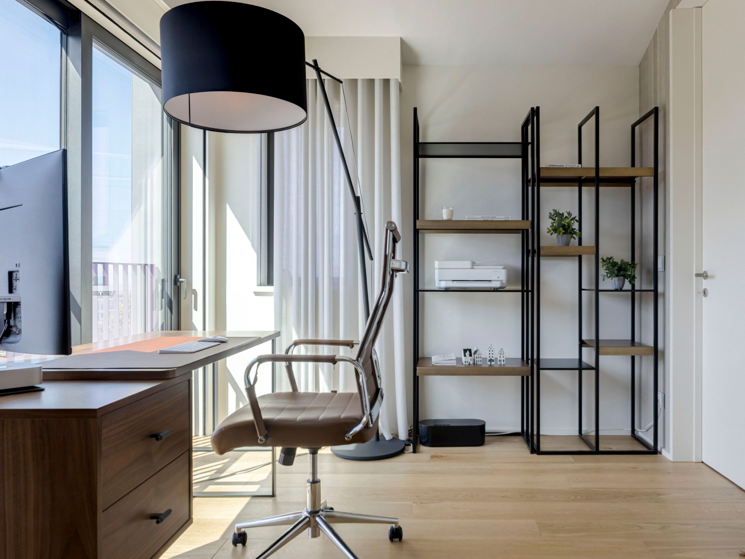 Nearby, the Olivier Side Table, between a set of armchairs, provides a discreet yet essential support element, complementing the overall composition of home office furniture. Natural materials and soft tones define the atmosphere, creating a space that feels both productive and composed.