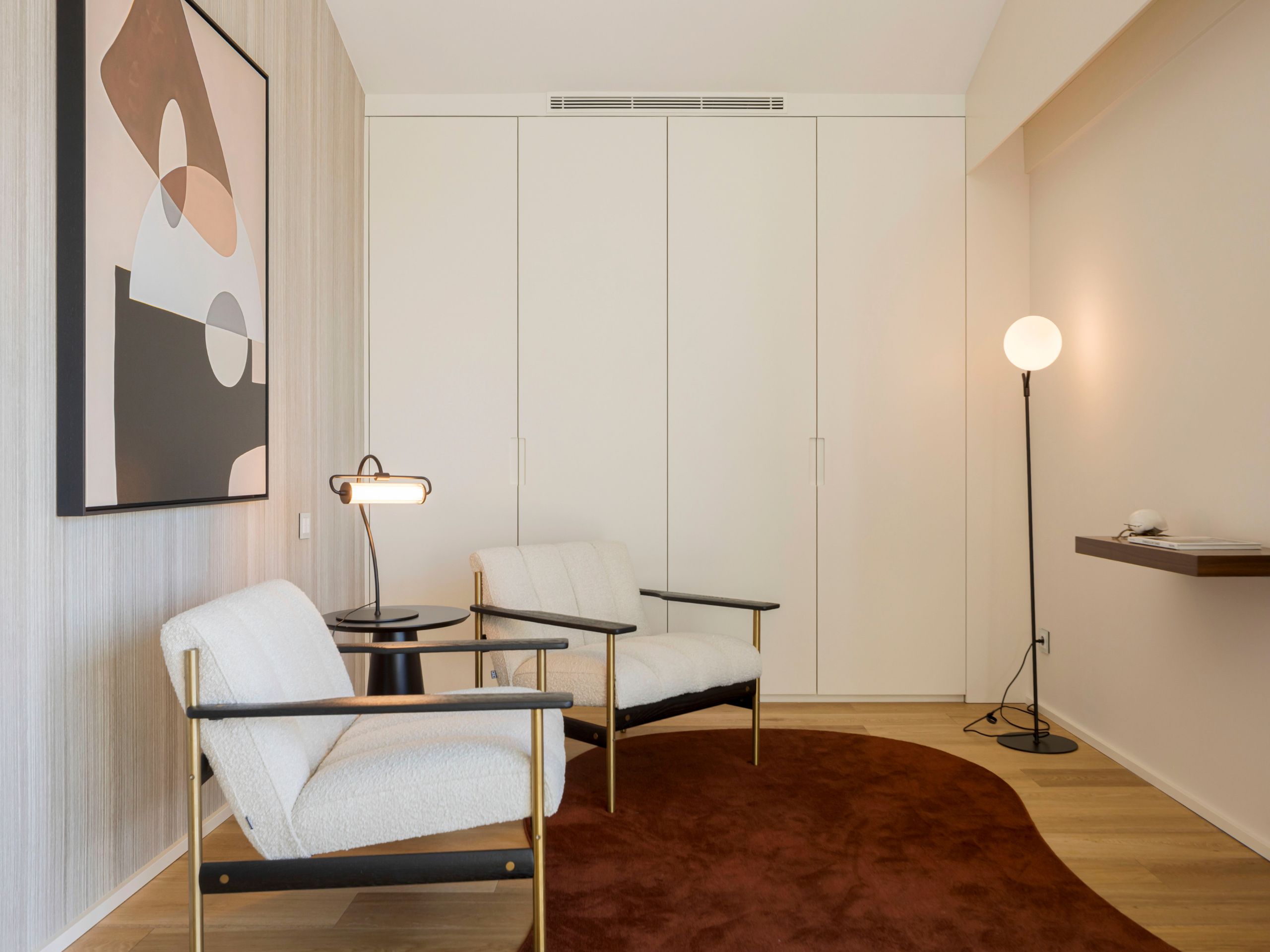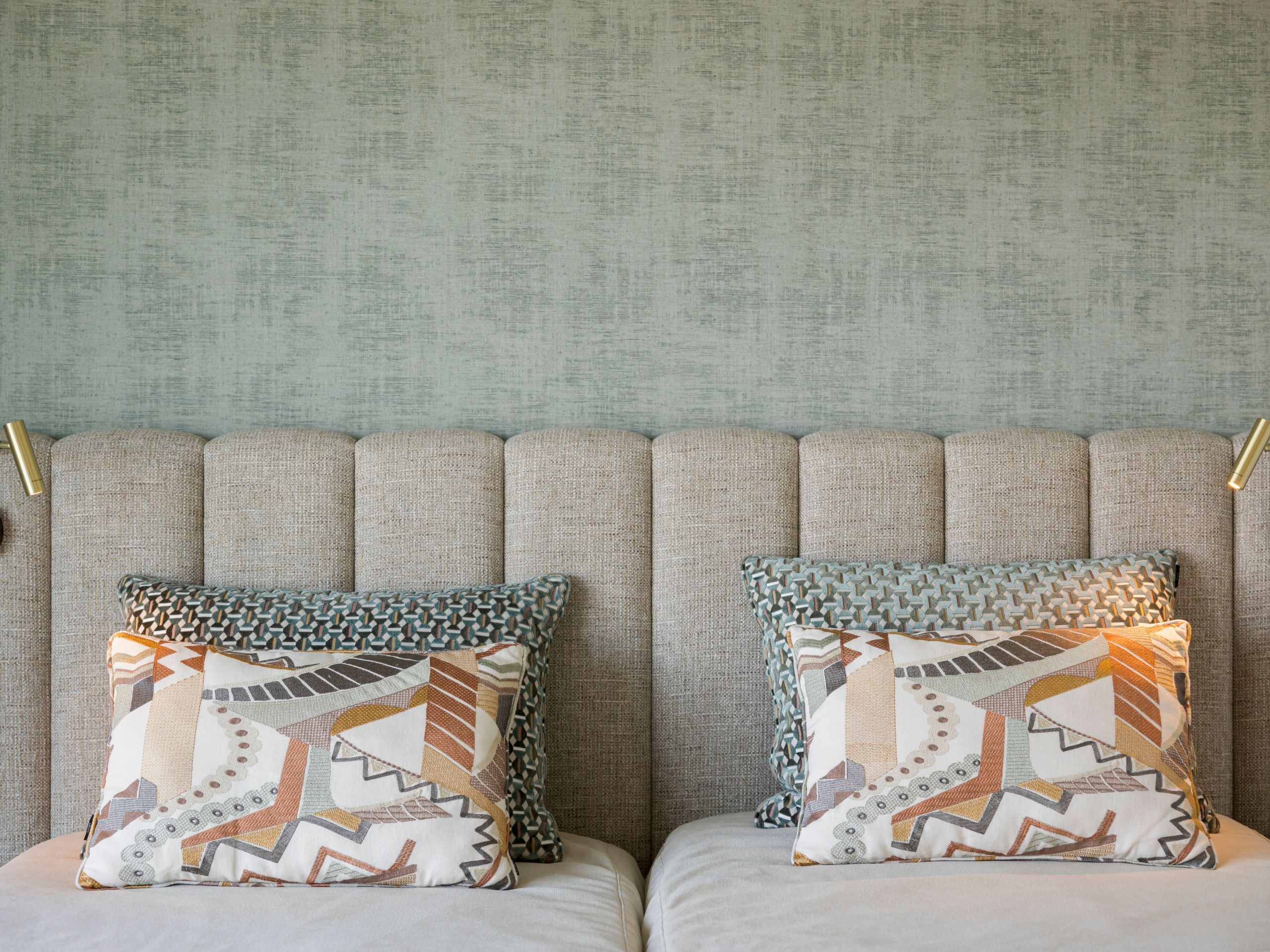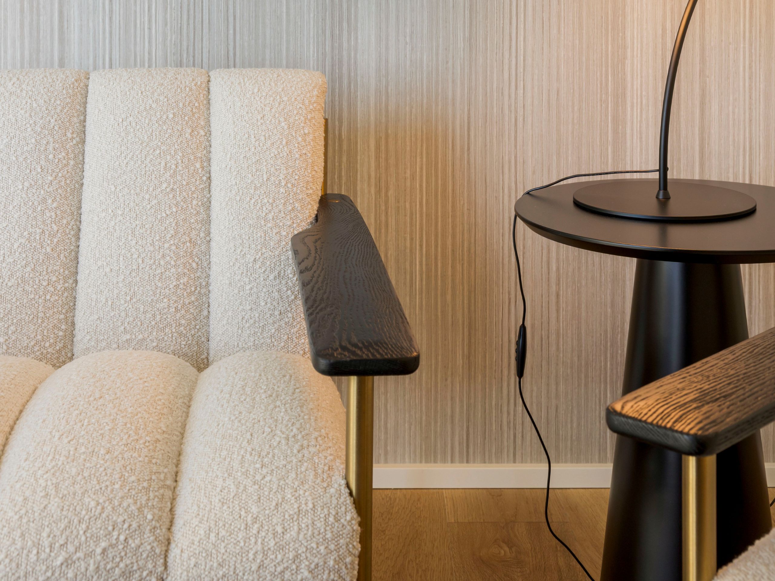 Completing the room, the Her Armchair and Sublime Stool in a patterned fabric offer a quiet moment of pause, combining elegant proportions with an inviting presence that enhances the suite’s serene atmosphere and reflects the essence of sophisticated bedroom furniture.