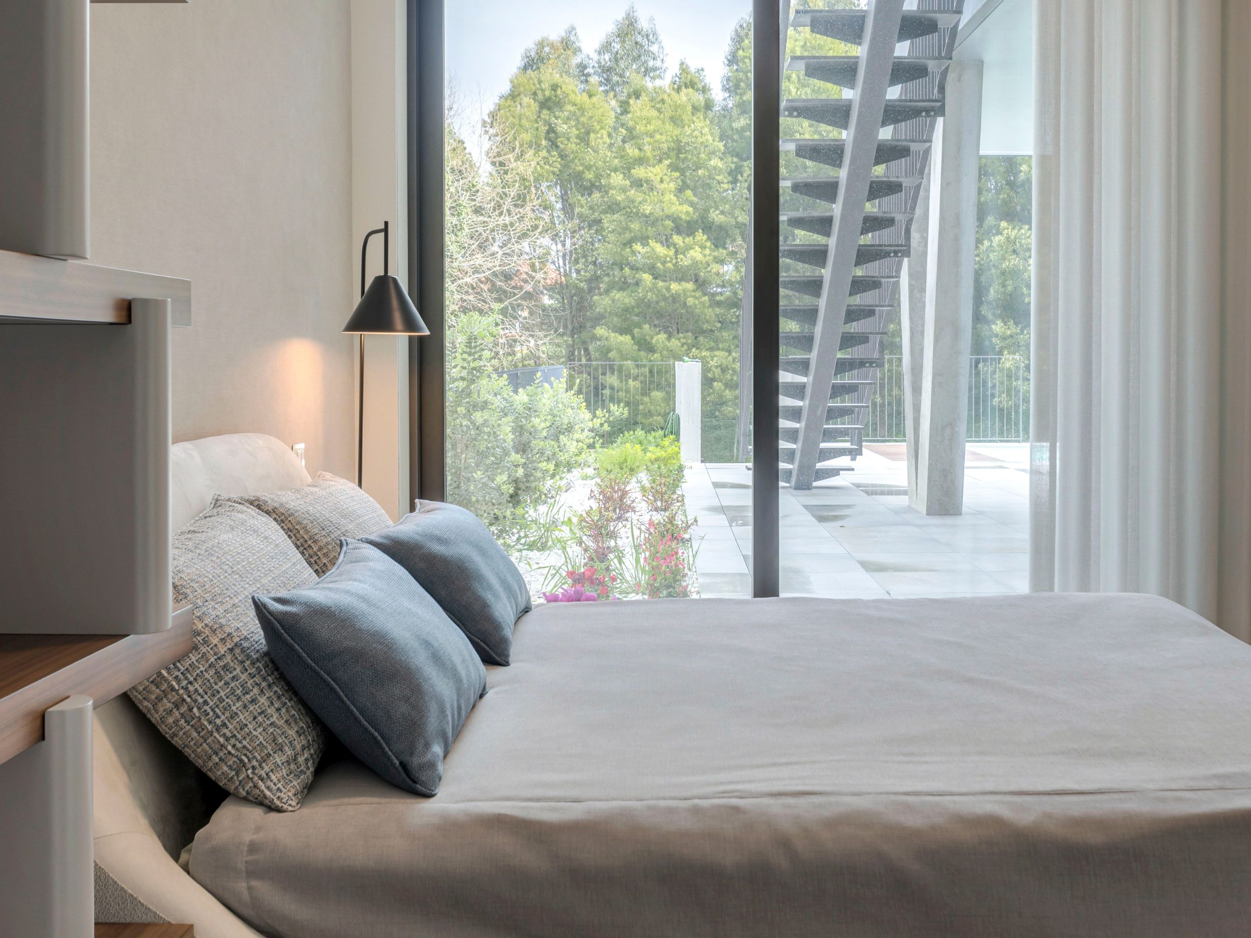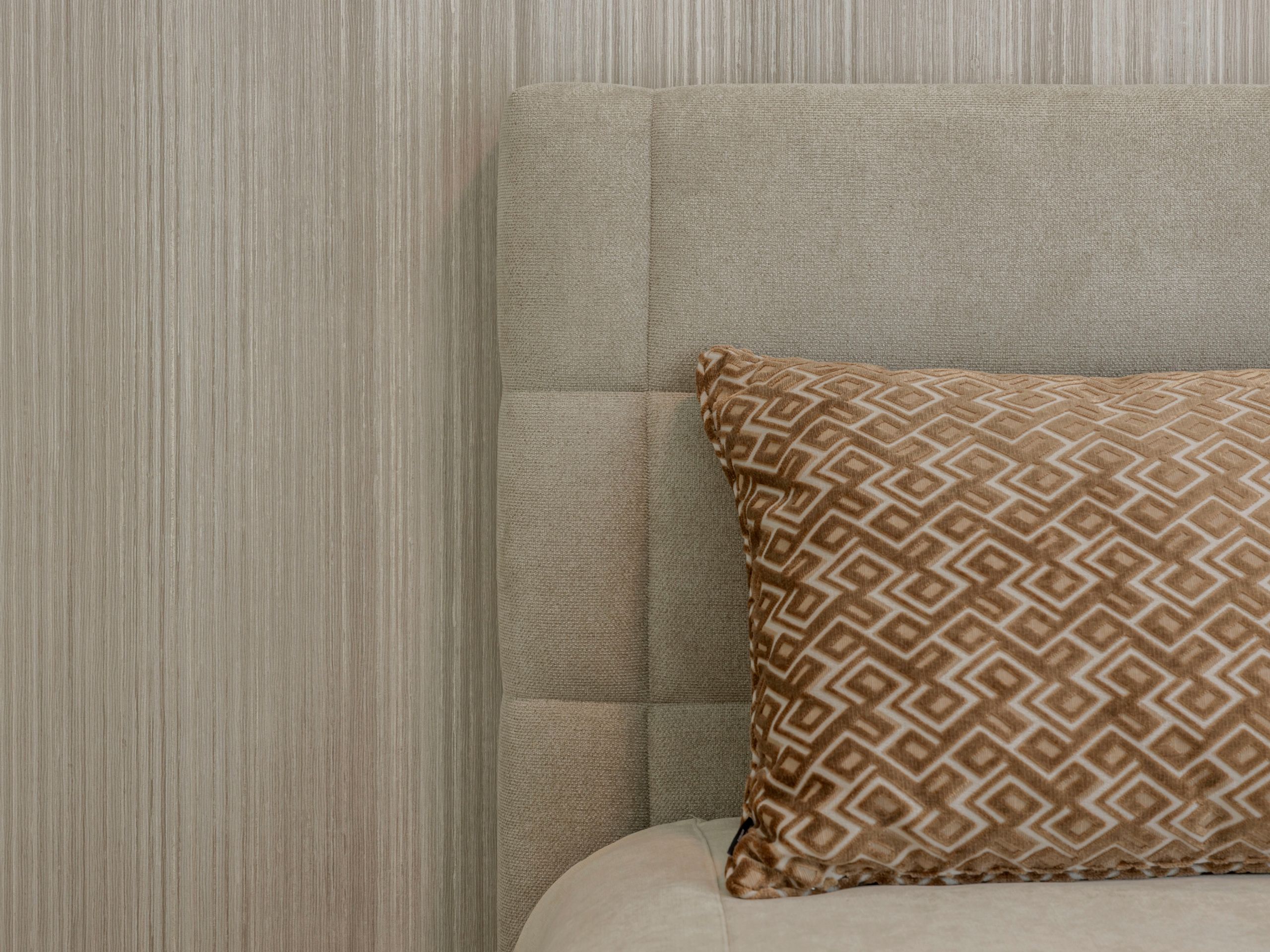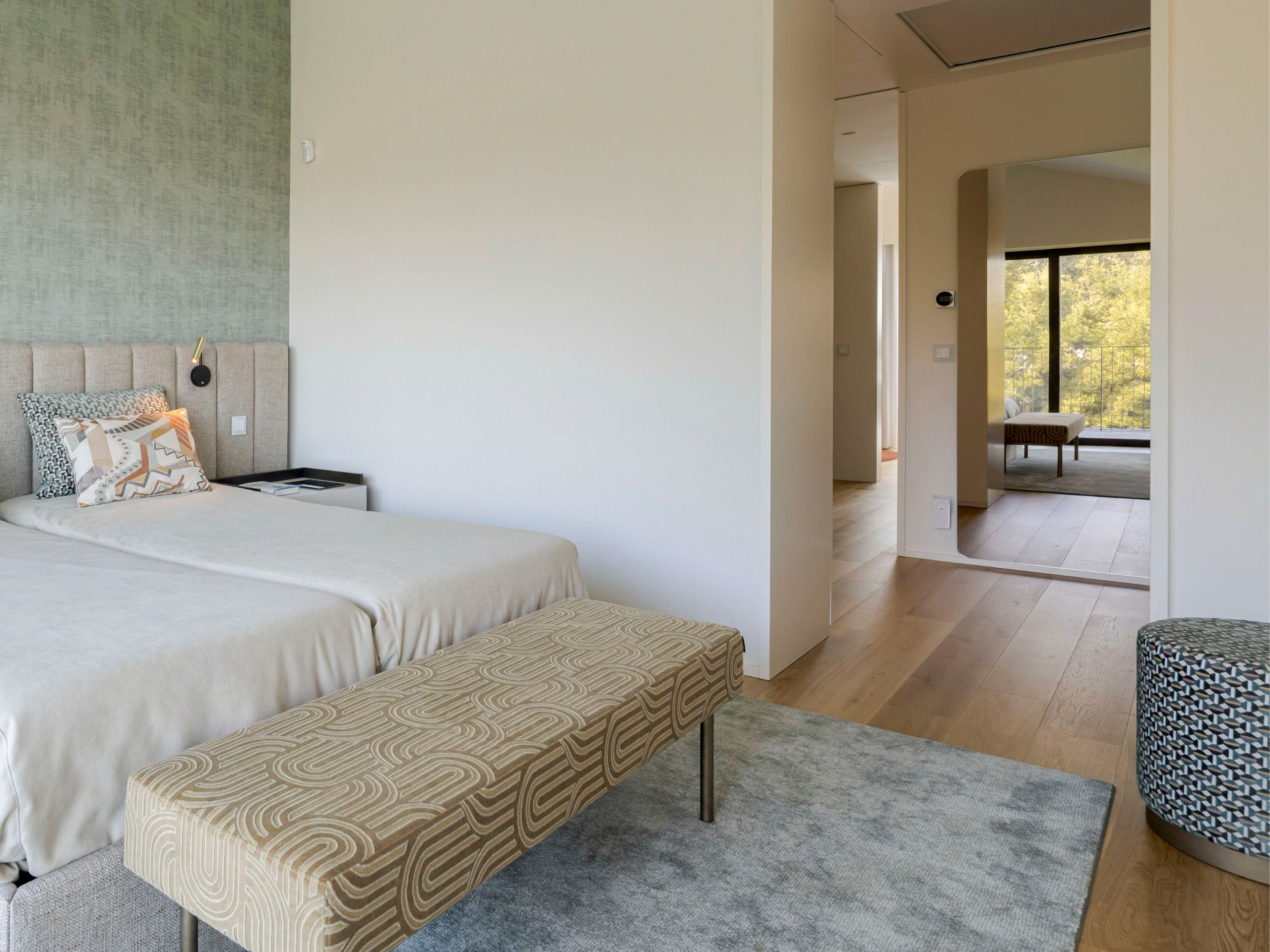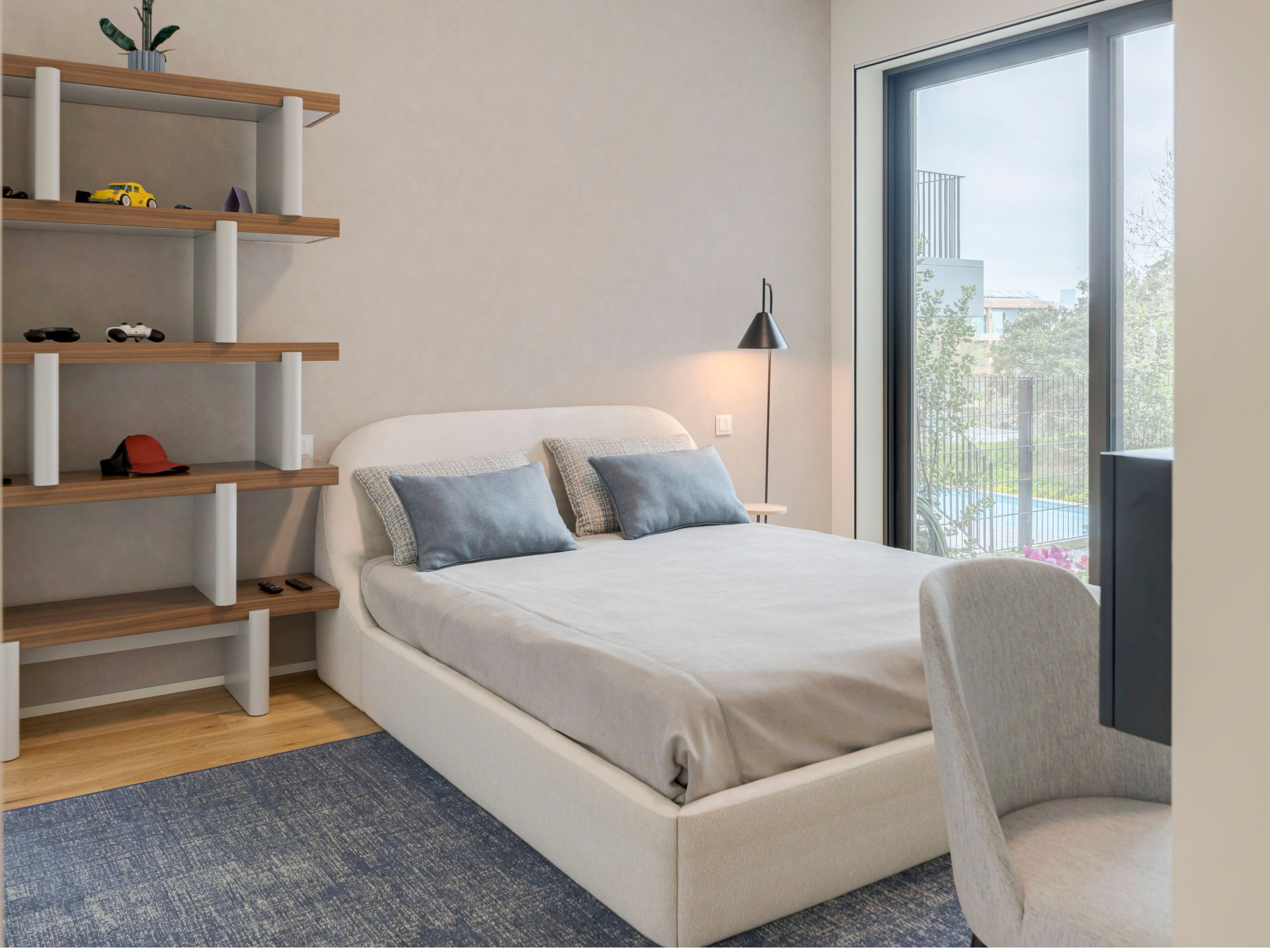 In the private areas, the design shifts toward a more intimate and serene expression. The master suite is filled with natural light, which enhances the softness of the materials and reinforces a calming atmosphere.