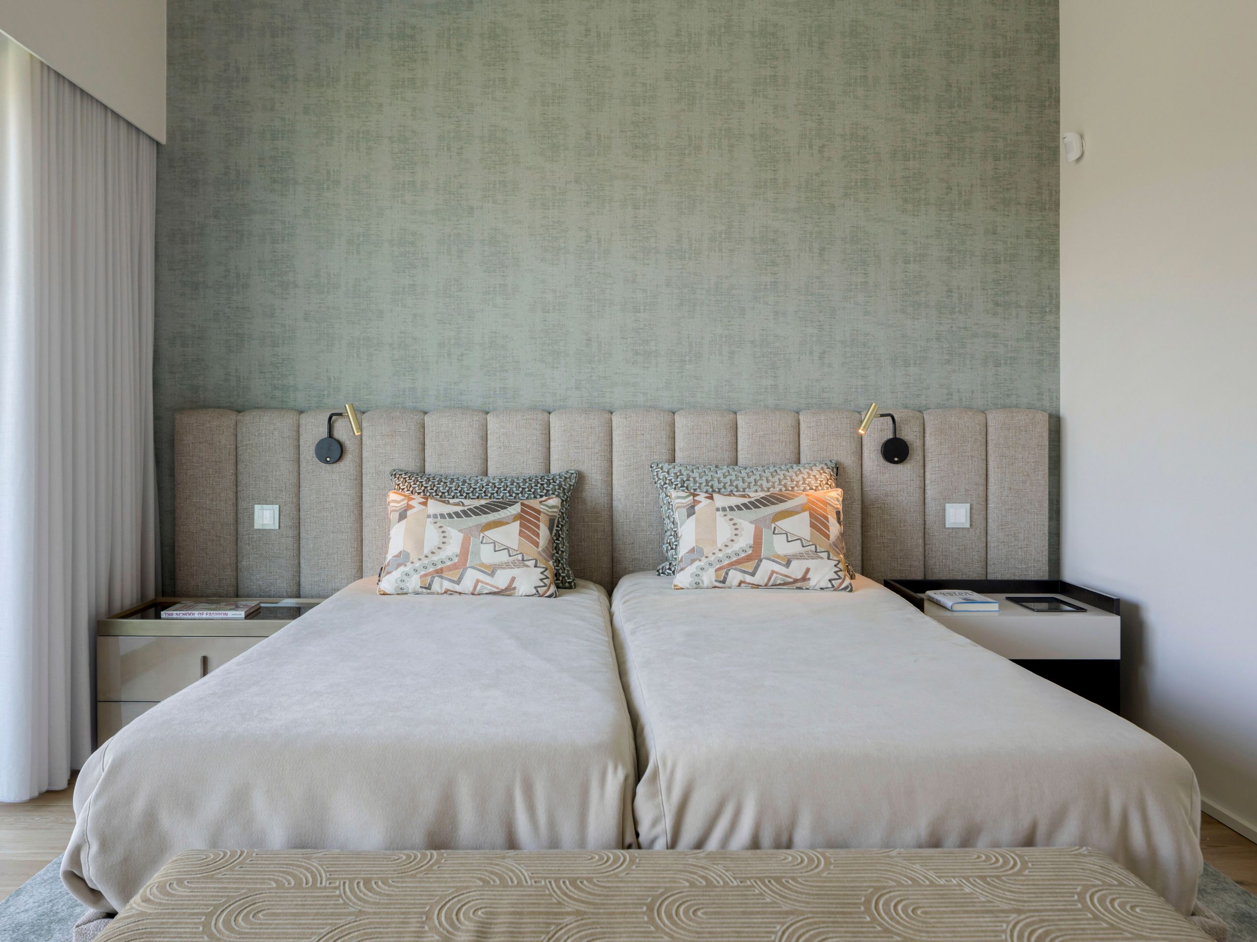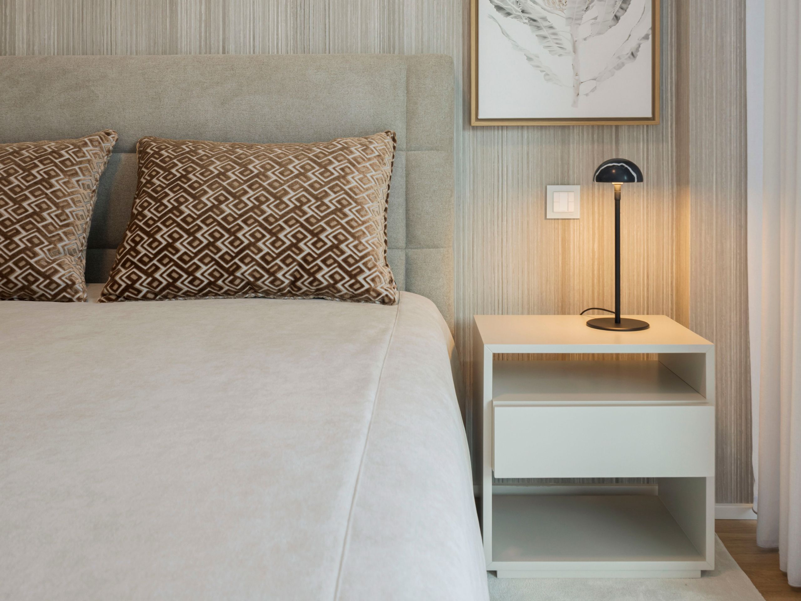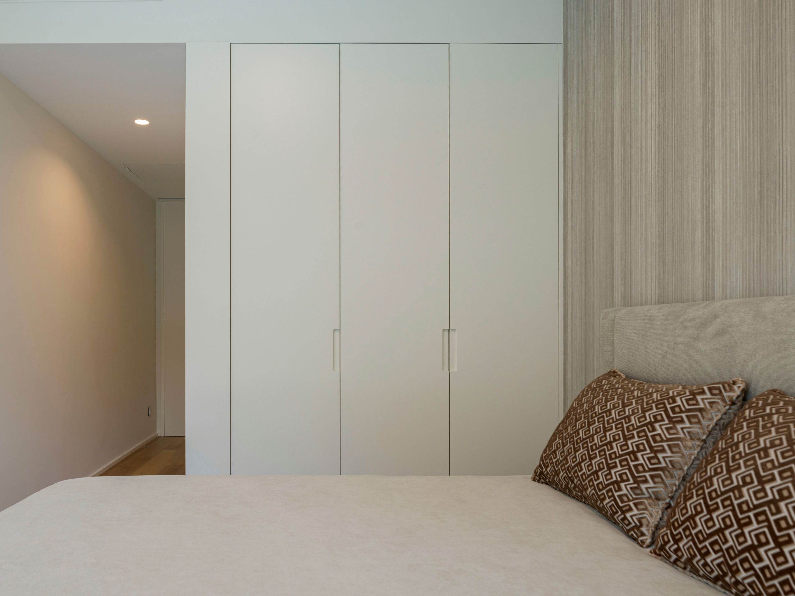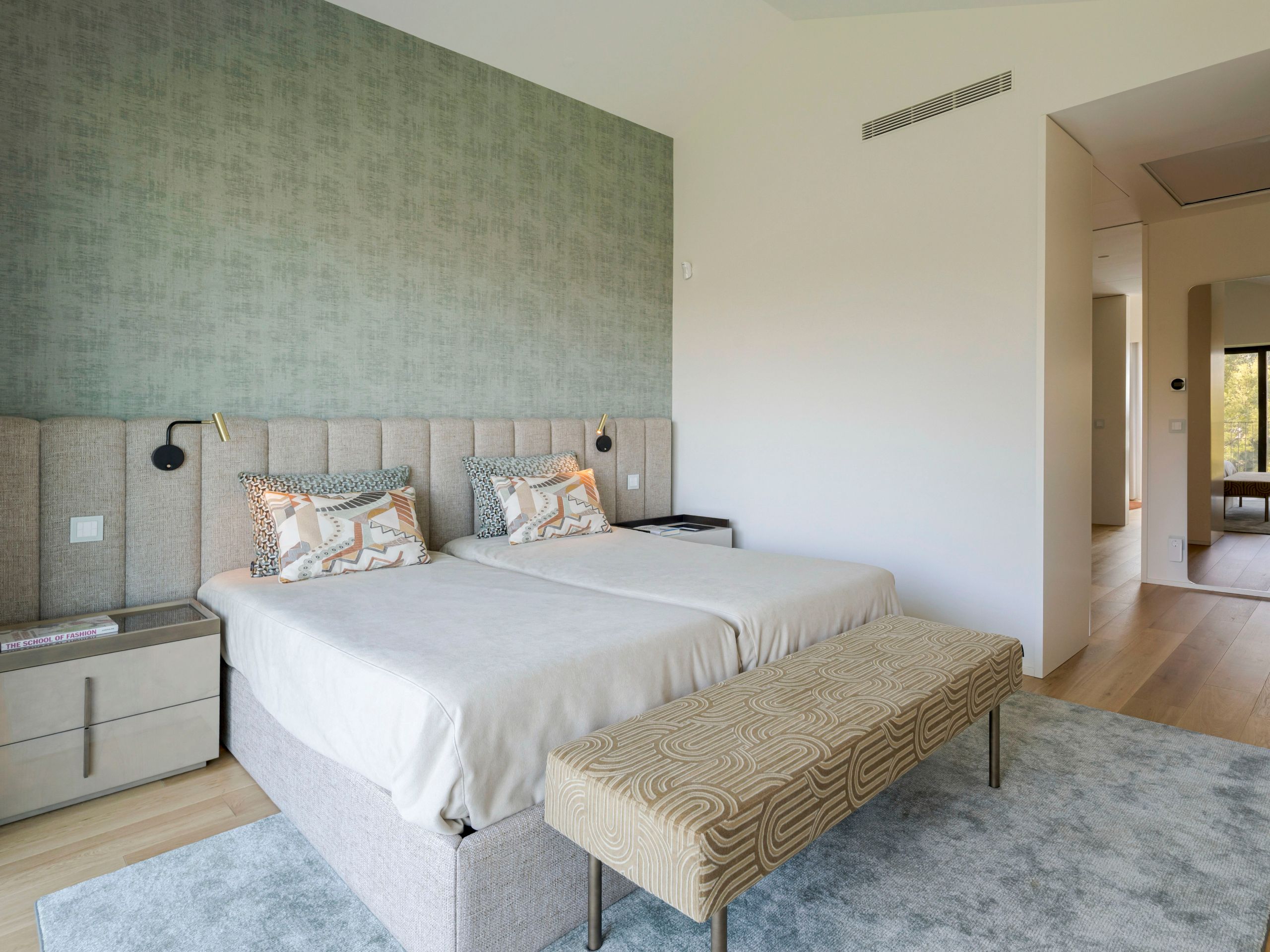 In the private areas, the design shifts toward a more intimate and serene expression. The master suite is filled with natural light, which enhances the softness of the materials and reinforces a calming atmosphere.