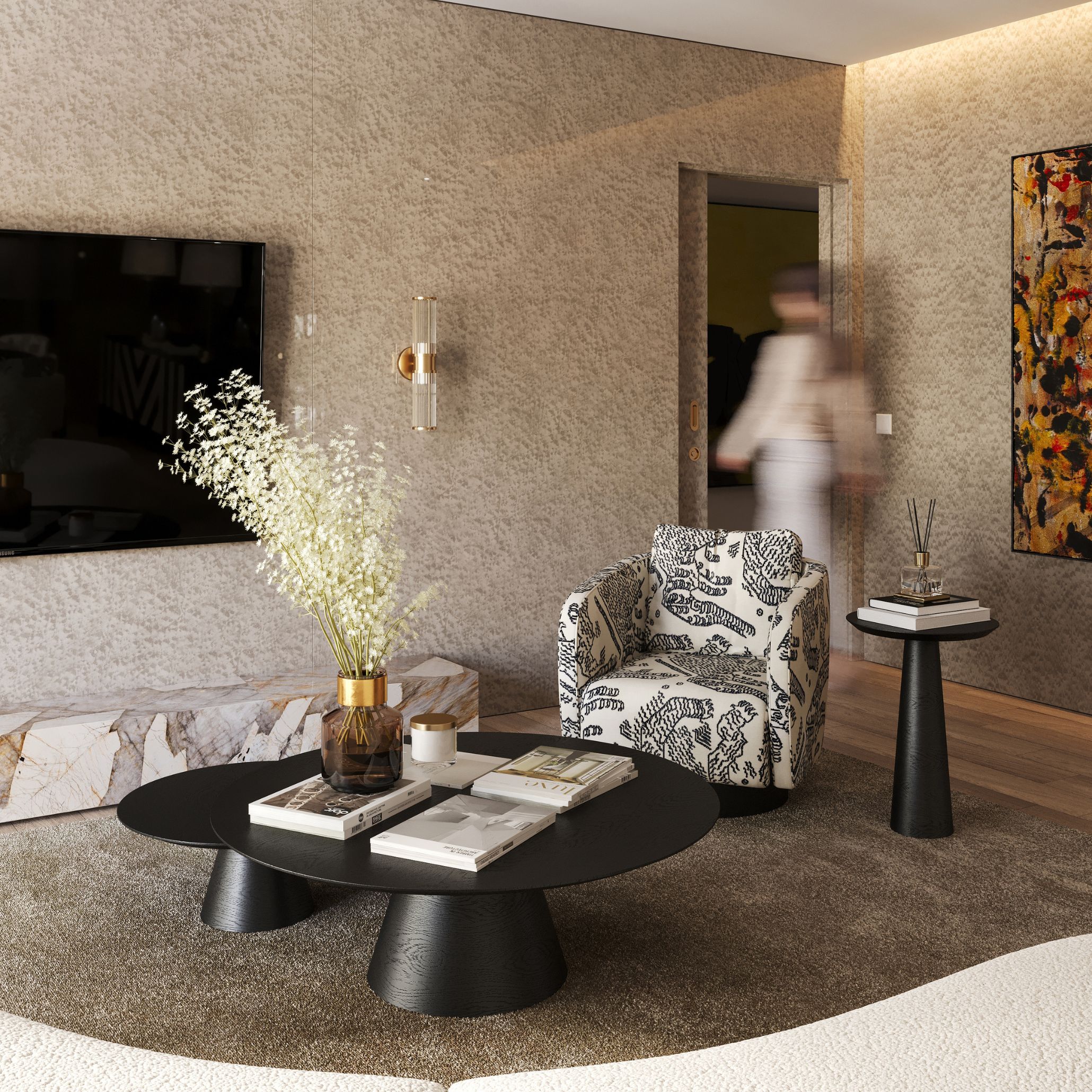 At its centre, the Sahara Coffee Tables create a grounded composition, their presence subtle yet essential. Nearby, the Her Armchair, enriched with the Tiger Mountain pattern, adds depth and personality, becoming a distinctive element within the room. Completing the arrangement, the Olivier Side Table offers a quiet support, balancing function with a light visual presence.