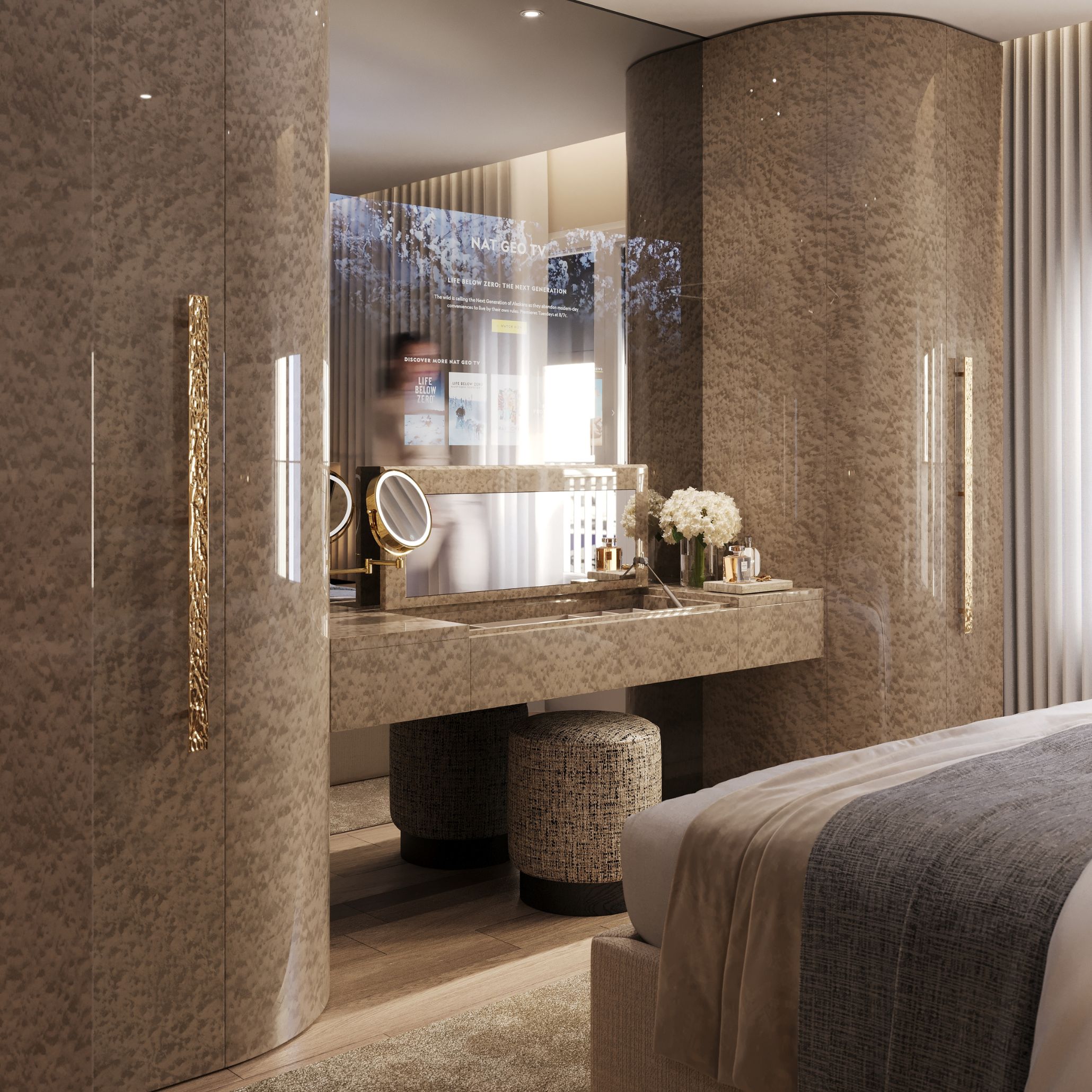 The master suite is designed as an intimate space, where soft tones and materials define a calm and elegant atmosphere. Every detail responds to daily rituals, creating a space that feels personal and composed, expressed through luxury master bedroom furniture.